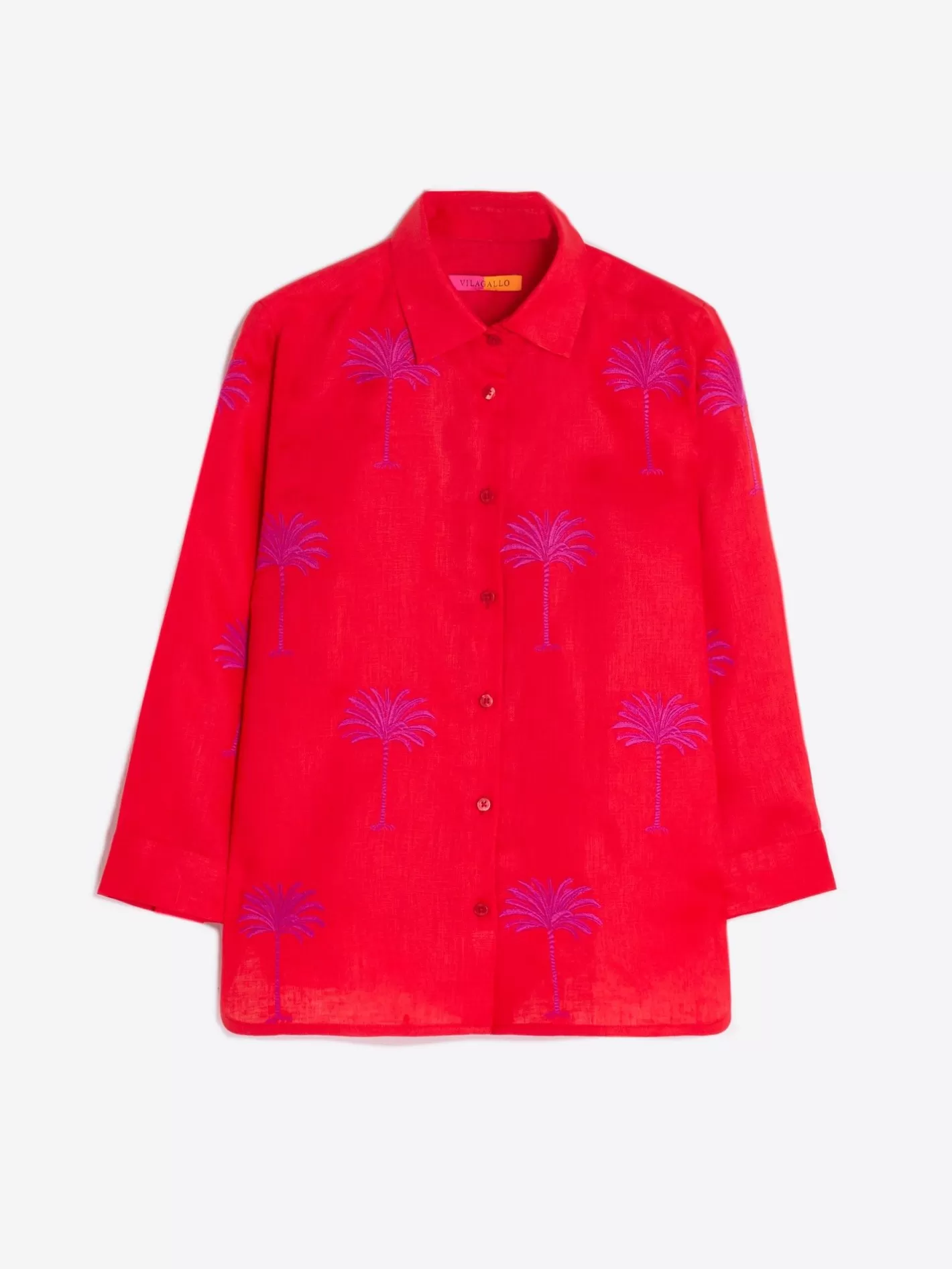Camisa 100% Lino Coral Con Palmeras Bordadas En Tonos Rosas. Mangas Fluidas. Tejido Exclusivo Vilagallo Confeccionado En…