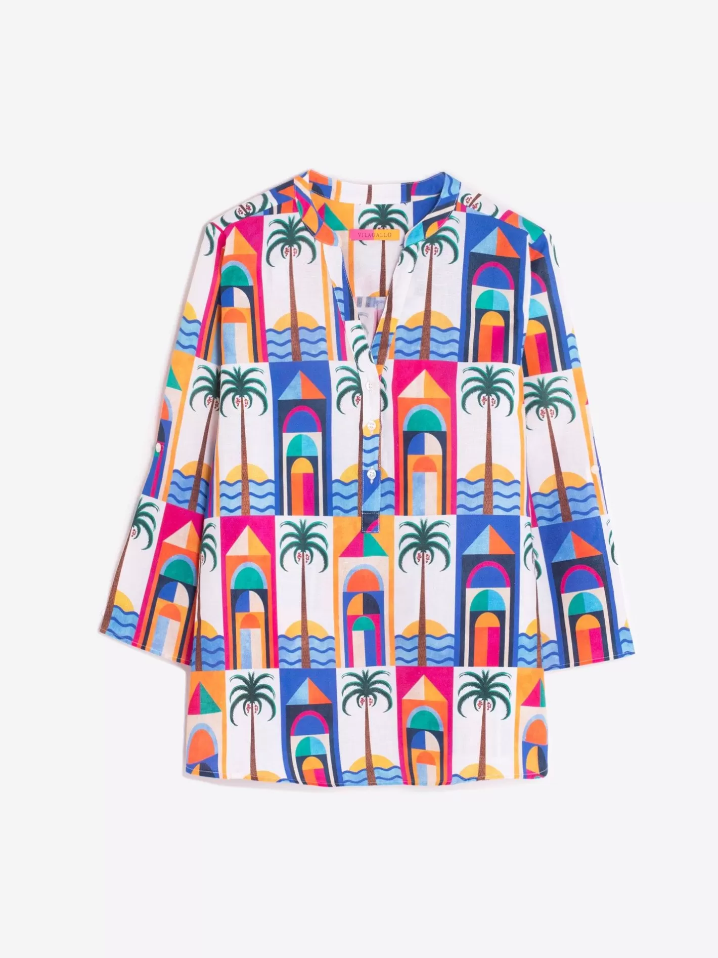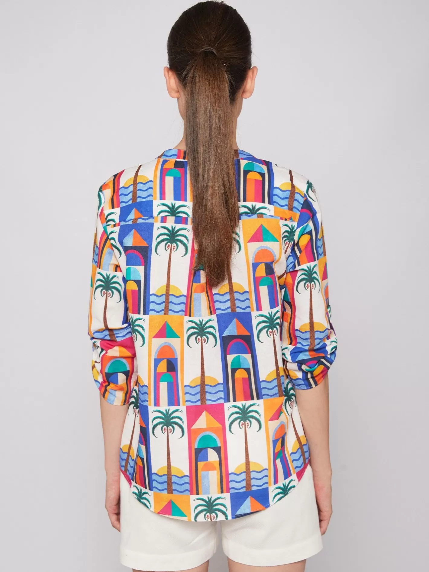 Camisa De Lino Estampada Con Palmeras Y Casitas. Cuello Redondo Y Escote En Pico Con Botones.Tejido Exclusivo Vilagallo …