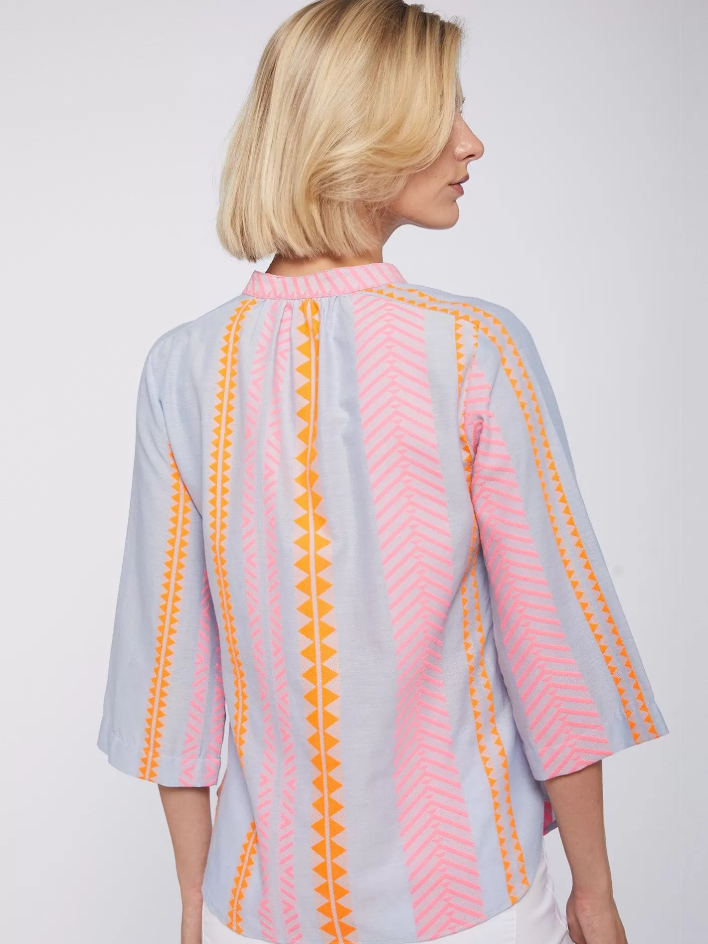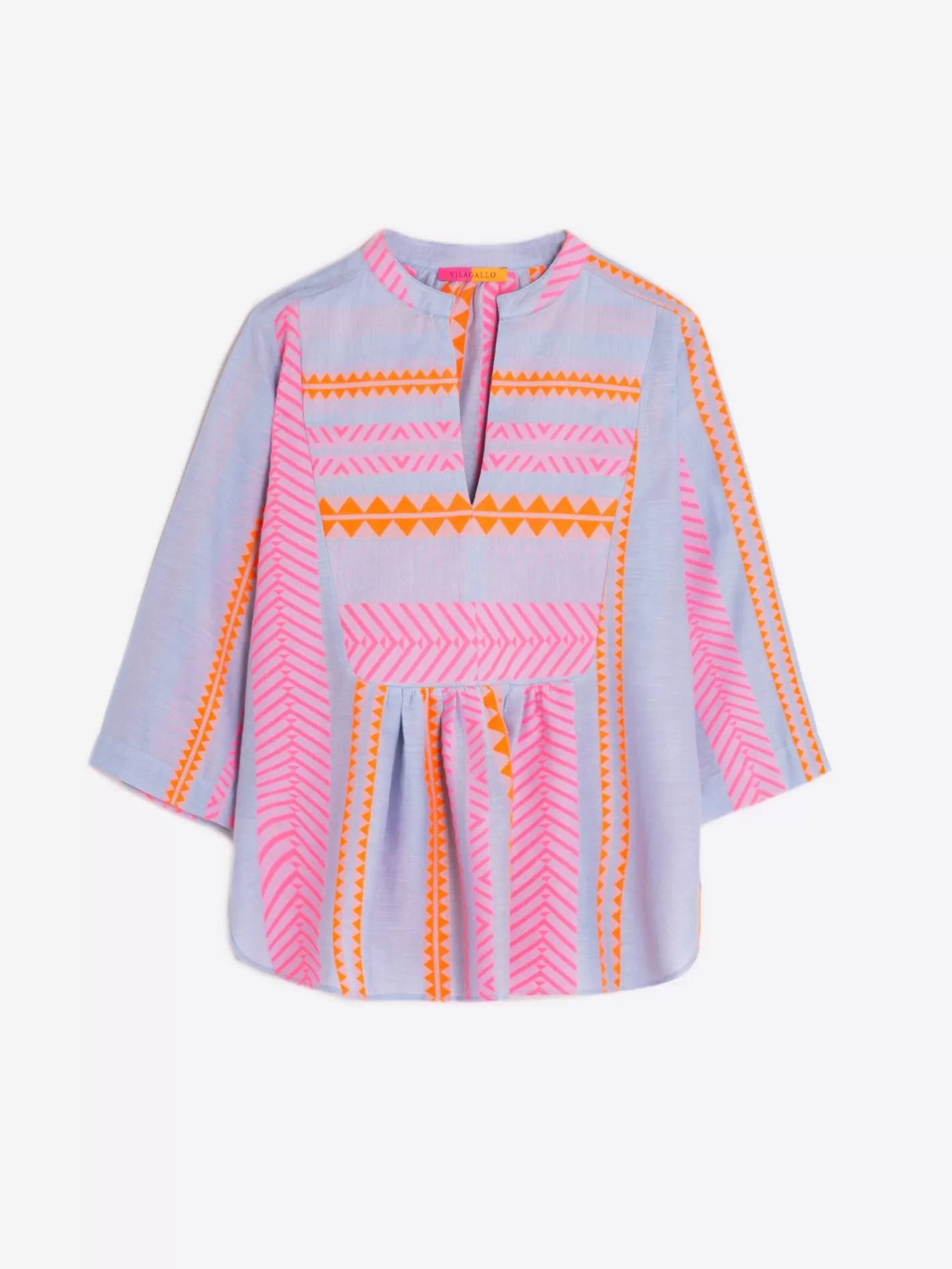 Camisa Azul Con Detalles Étnicos En Rosa Y Naranja. Corte Ancho Y Cuello En Pico. Tejido Exclusivo Vilagallo Confeccionado En España. La Modelo Mide 1,76Cm Y Usa La Talla 38.