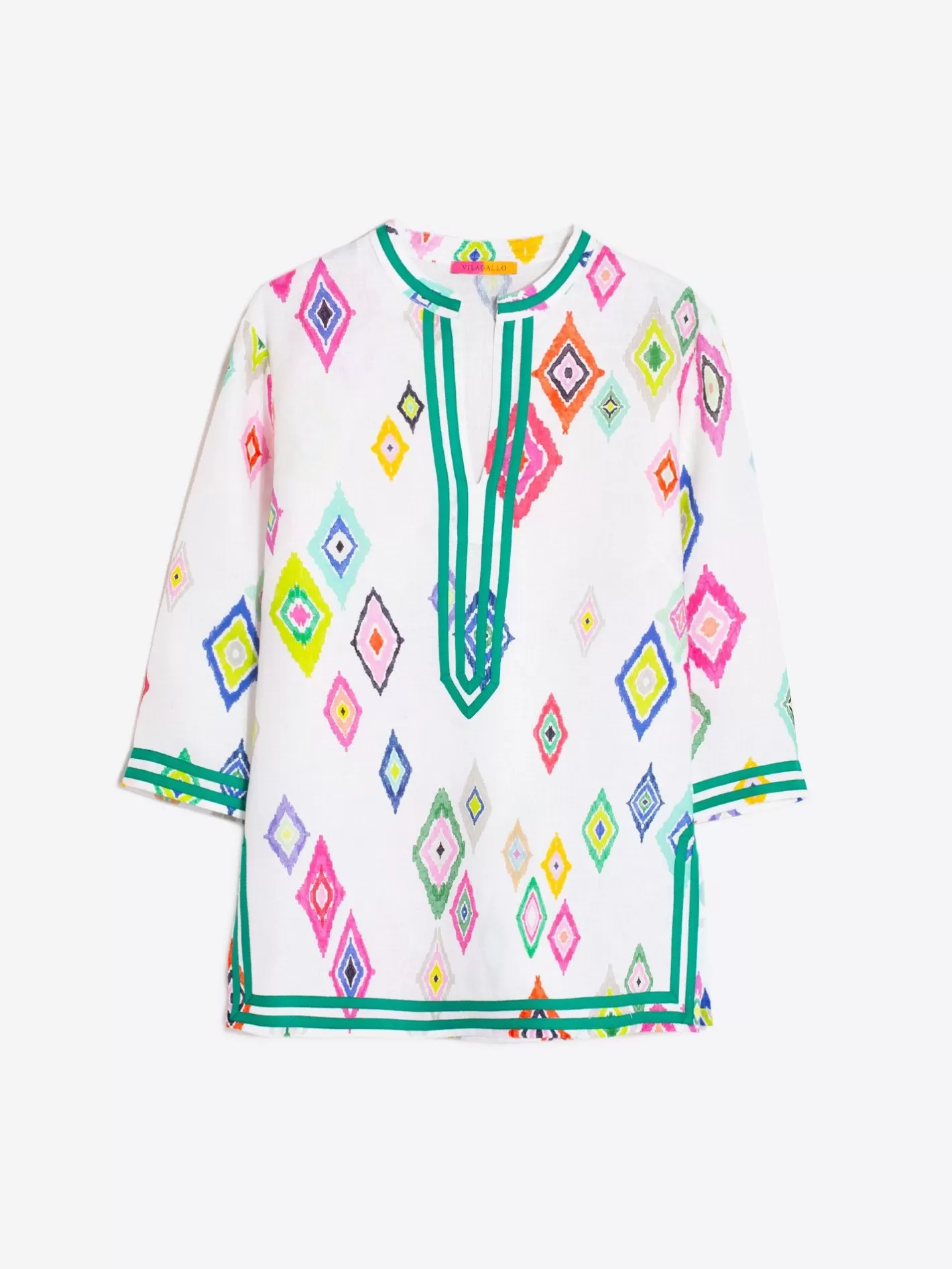Camisa Blanca De Lino Con Estampado De Rombos Multicolores Y Rayas Verdes Marcando El Patón. Cuello Redondo Y Manga Francesa.Tejido Exclusivo Vilagallo Confeccionado En España. La Modelo Mide 1,76Cm Y Usa La Talla 38.