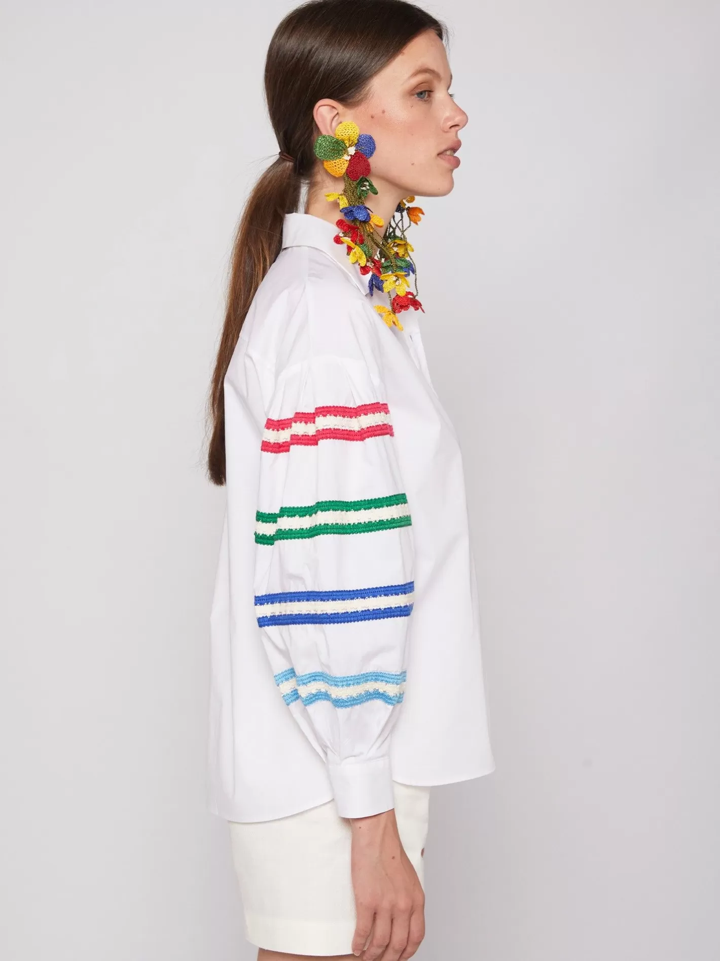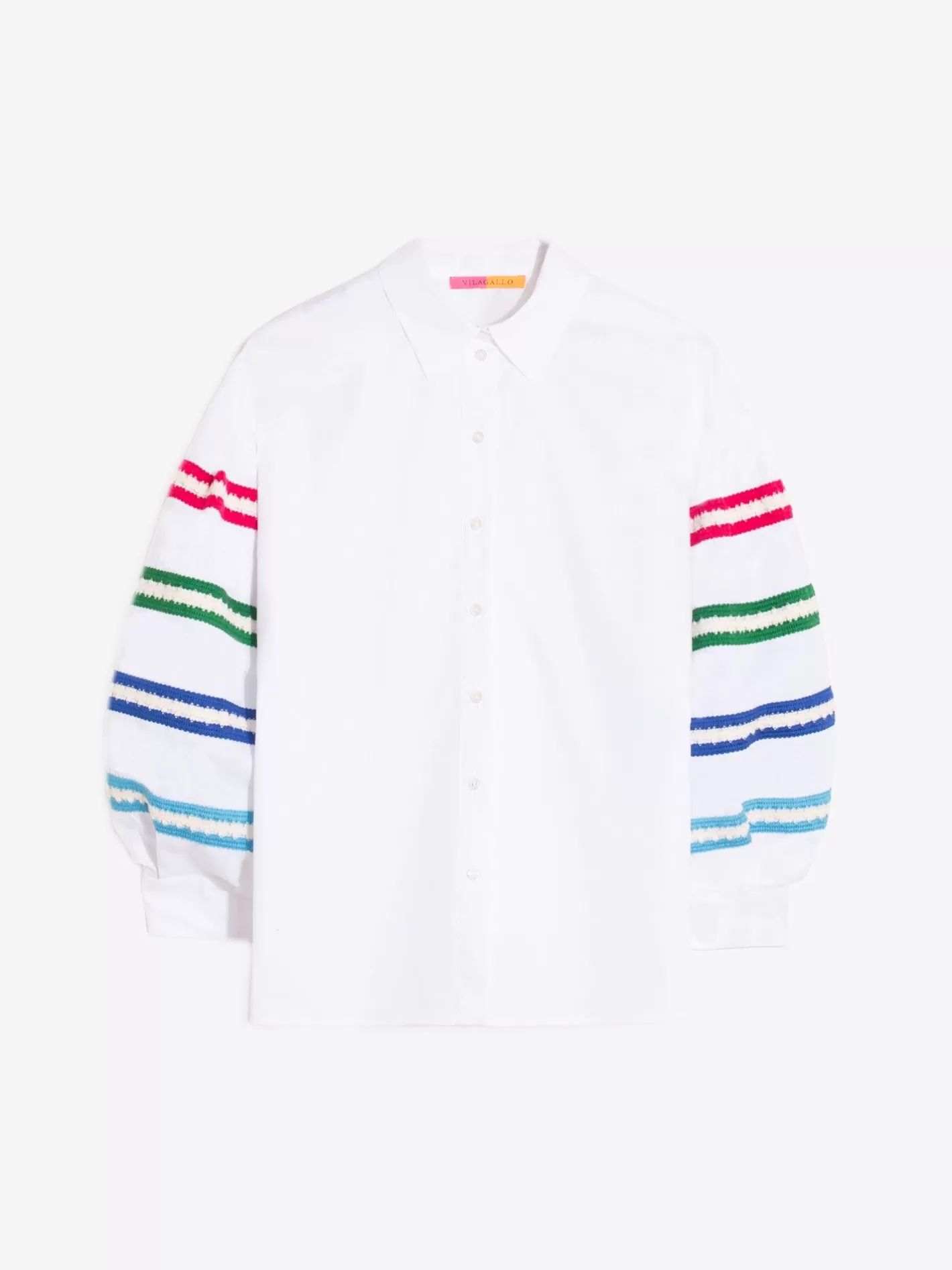 Camisa Blanca Con Detalles De Rayas Multicolores En Las Mangas. Escote Con Cuello Redondo. Tejido Exclusivo Vilagallo Co…