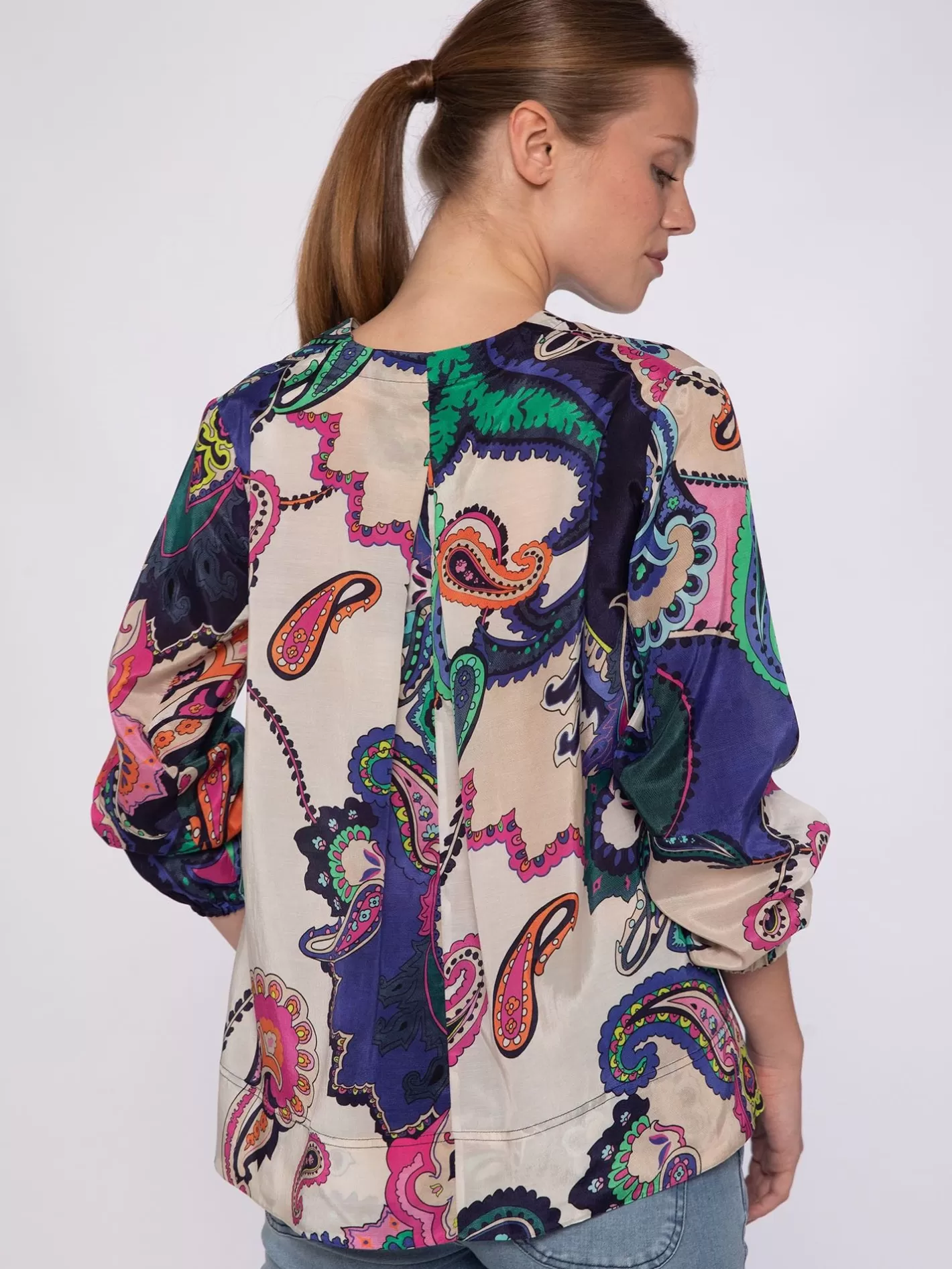 Camisa Con Estampado Paisley En Tonos Azules, Verdes Y Rosas. Mangas Abullonadas Con 3 Botones En La Zona Del Escote. Te…