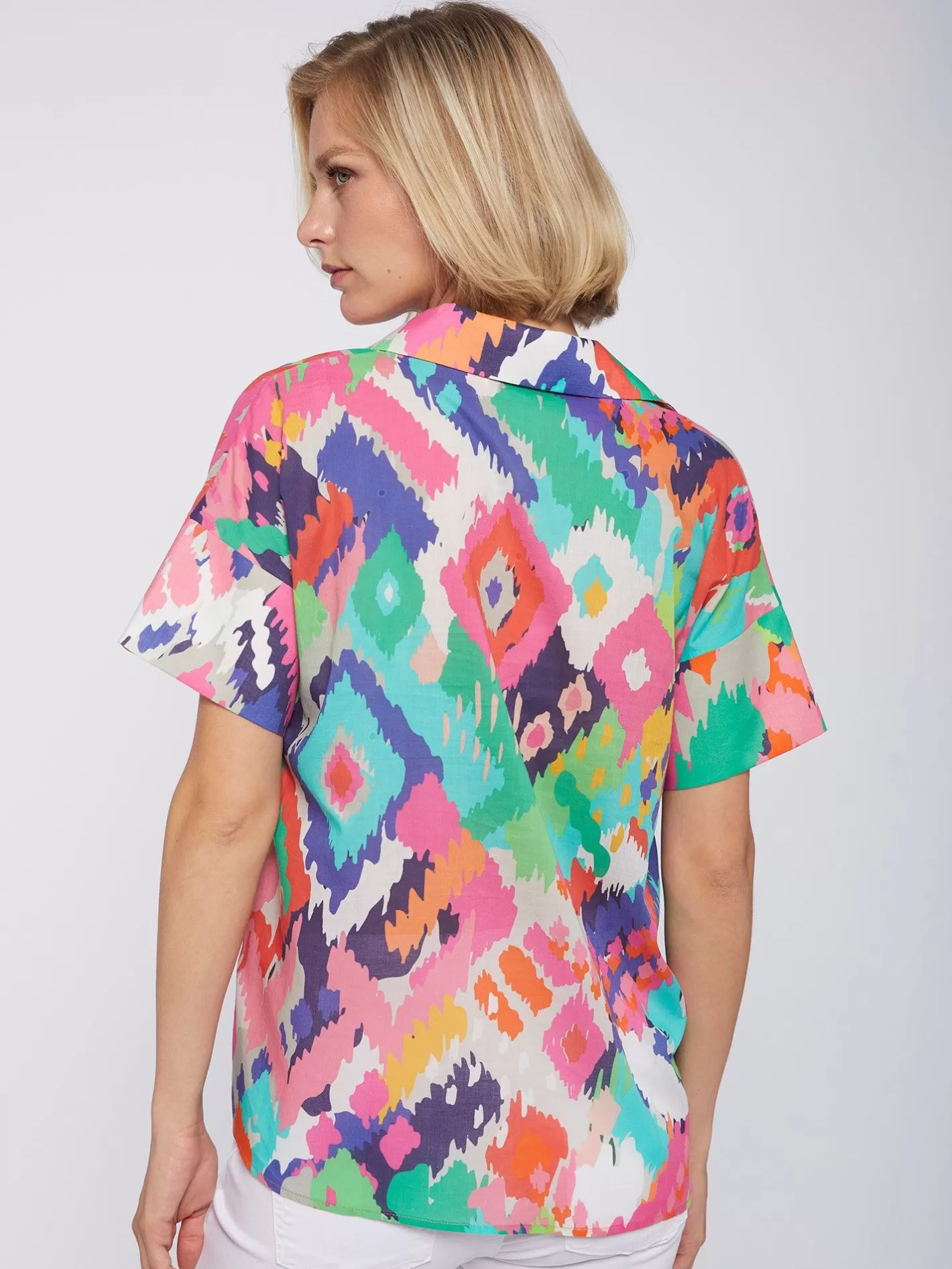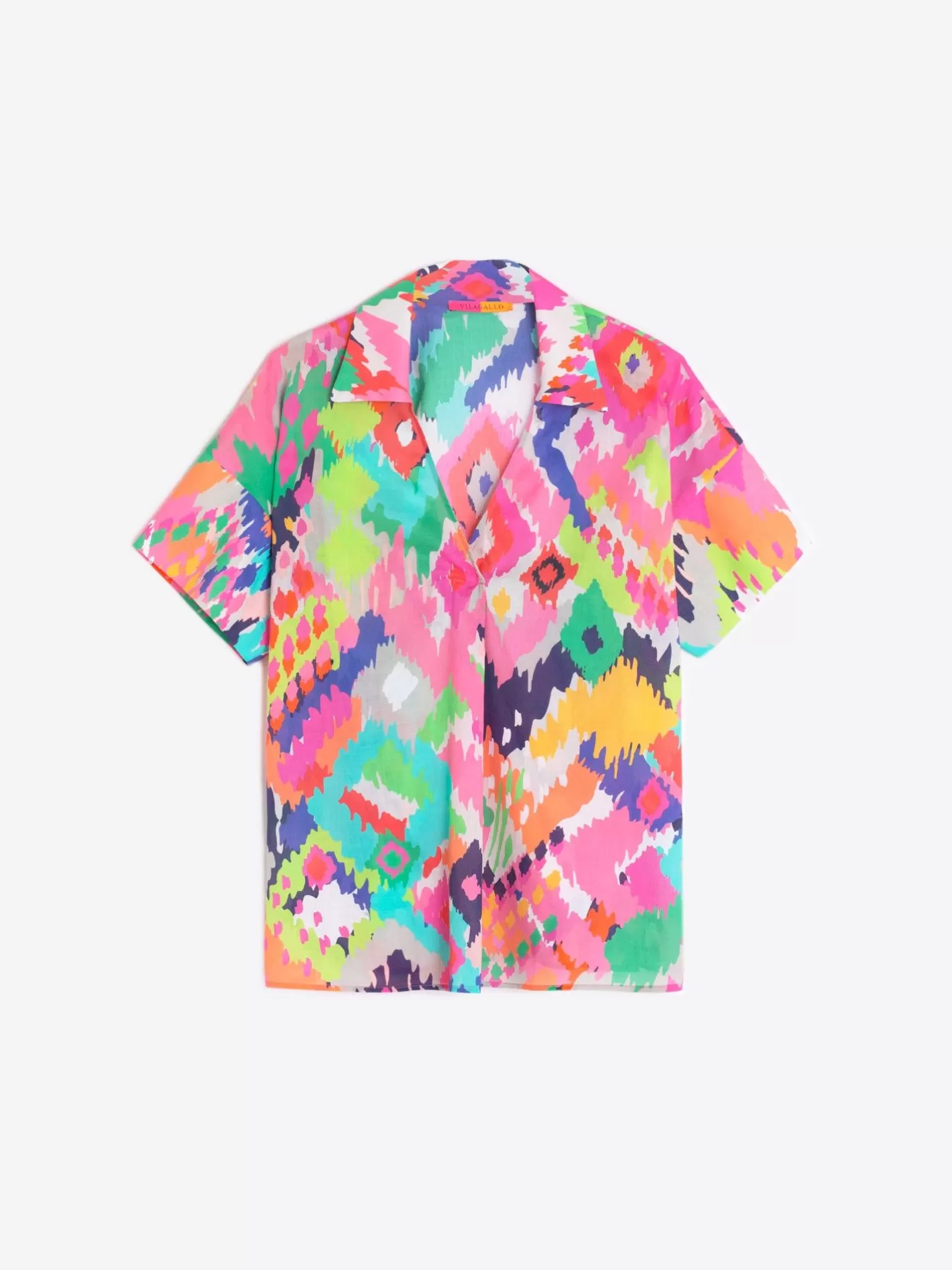 Camisa De Algodón Con Estampado Ikat Inspirado En Acuarelas. Manga Corta Y Cuello En Pico. Tejido Exclusivo Vilagallo C…