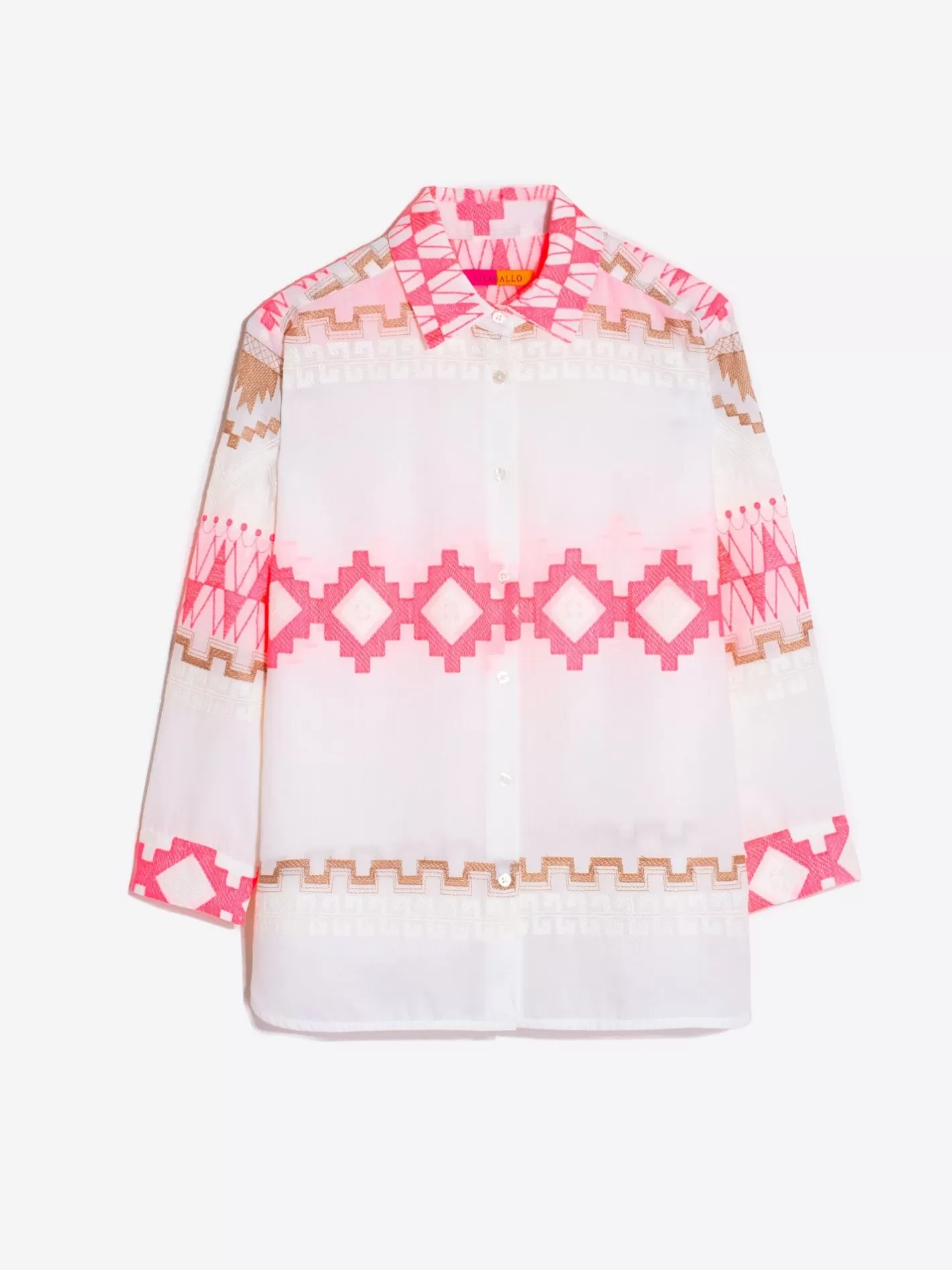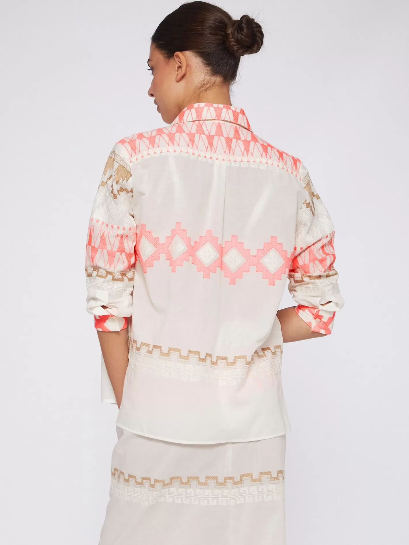 Camisa De Algodón Con Bordado Étnico En Tonos Rosas Y Camel. Botones En La Parte Delantera. Tejido Exclusivo Vilagallo…