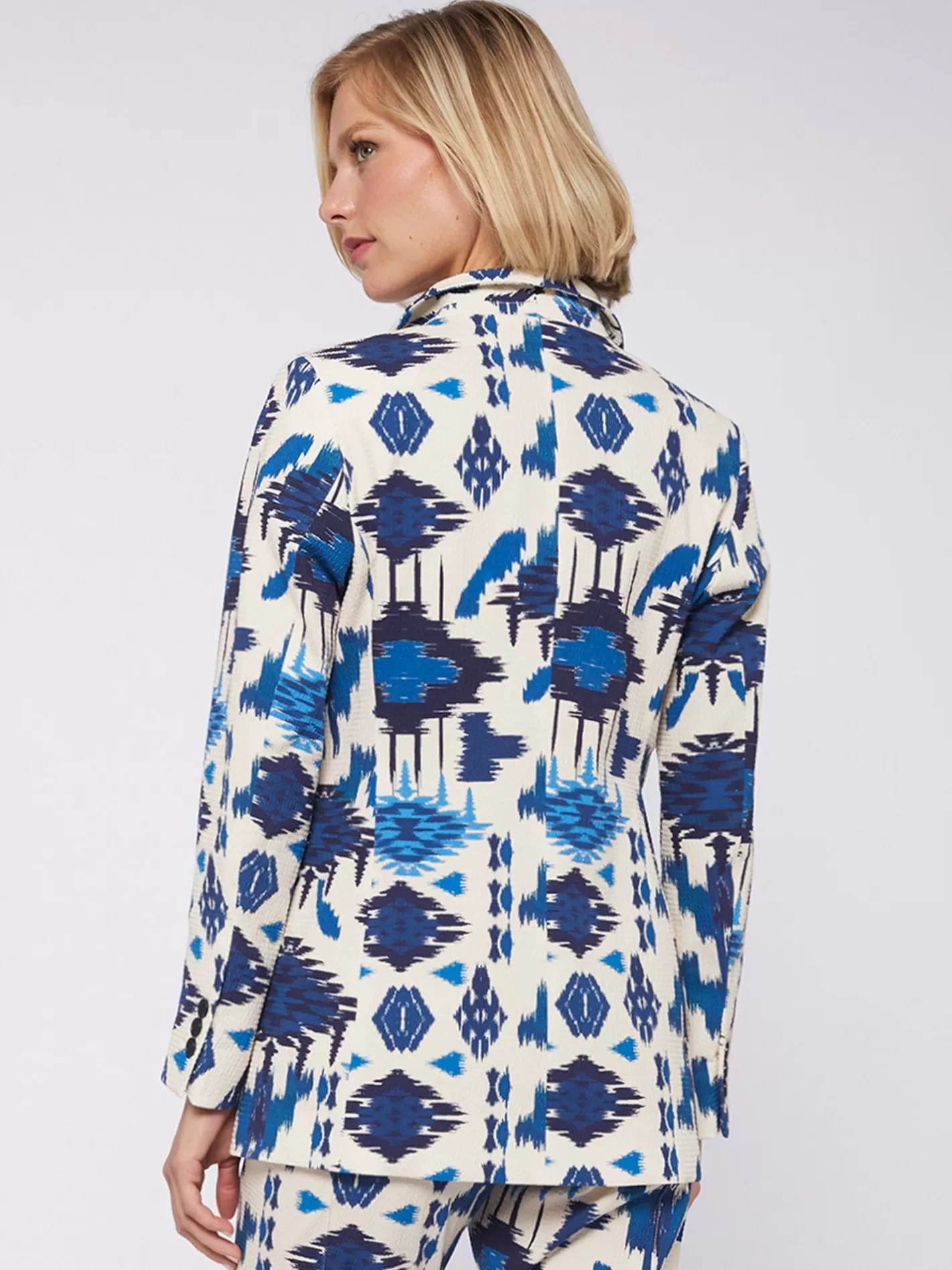 Americana Con Estampado Ikat En Tonos Azules Y Fondo Crudo. Cierre Mediante Un Botón Delantero. Solapa De Pico. Bolsillos De Vivo. La Modelo Utiliza La Talla 38.