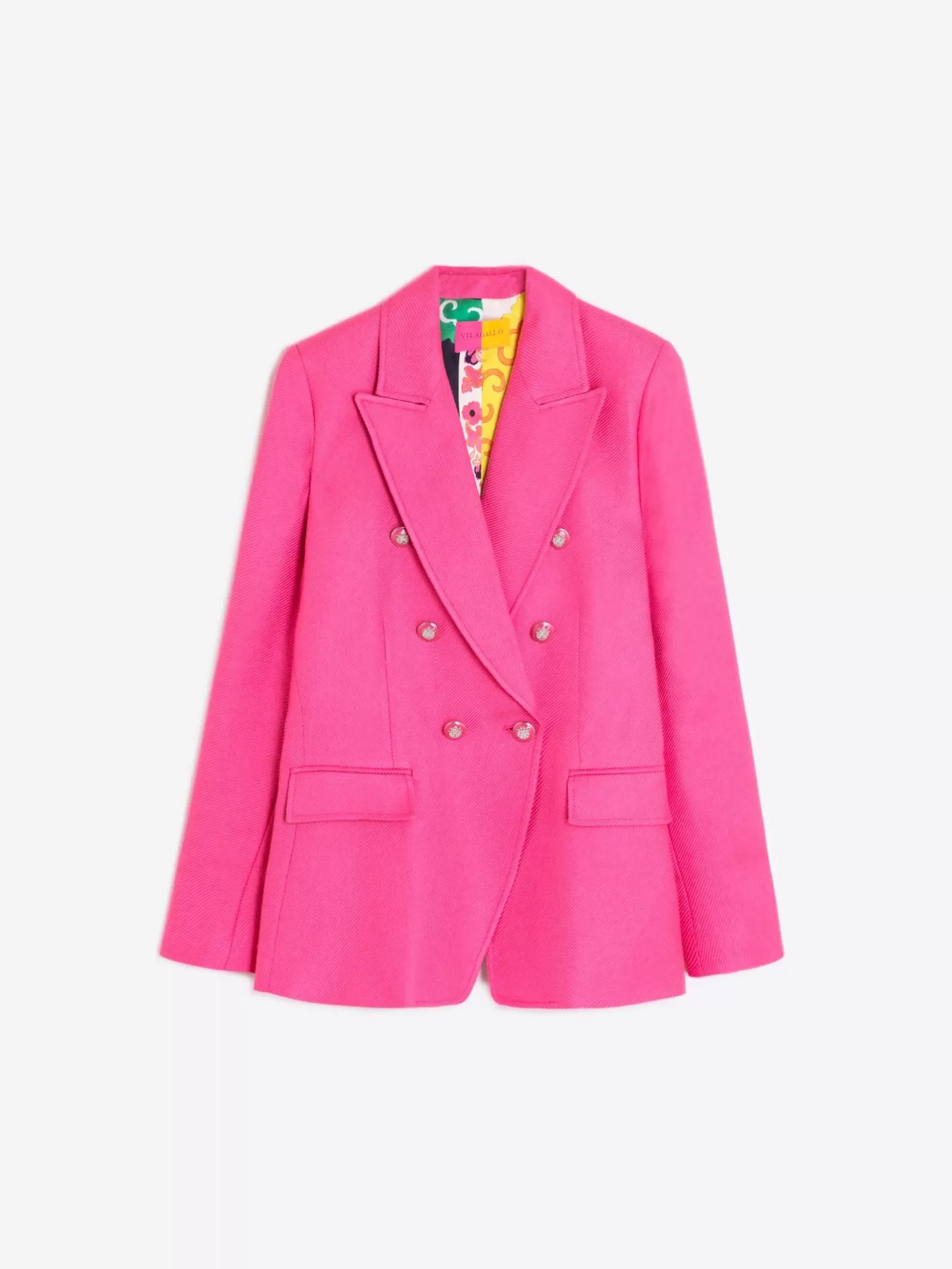 Chaqueta Cruzada Rosa. Doble Abotonadura Dorada. Solapa De Pico. Bolsillos Con Carteras. Forro Exclusivo Vilagallo Estampado En España. La Modelo Utiliza La Talla 38.