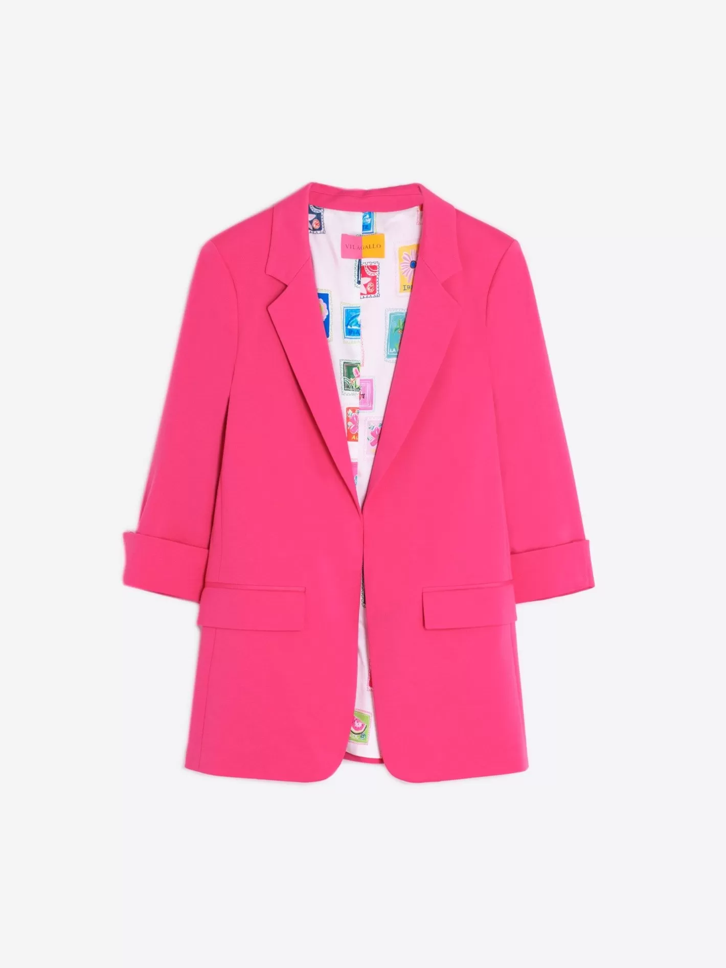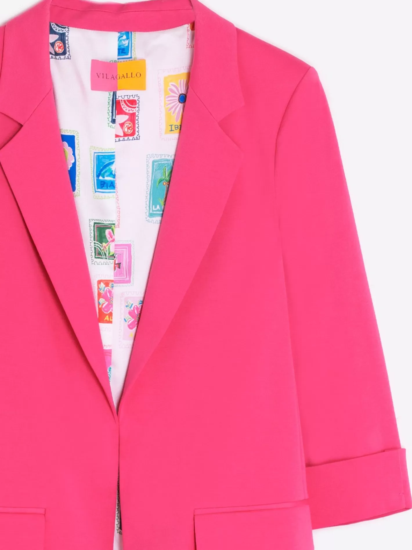 Chaqueta Rosa De Punto Elástico. Botón Frontal. Bolsillos Con Carteras. Forro Exclusivo Vilagallo Estampado En España. La Modelo Utiliza La Talla 38.