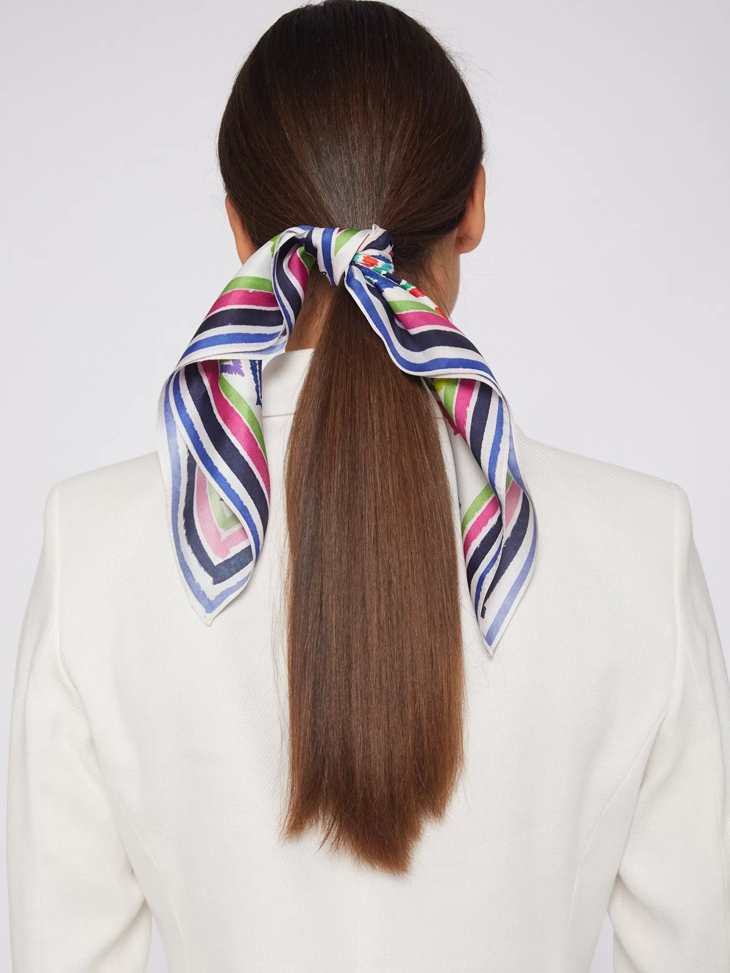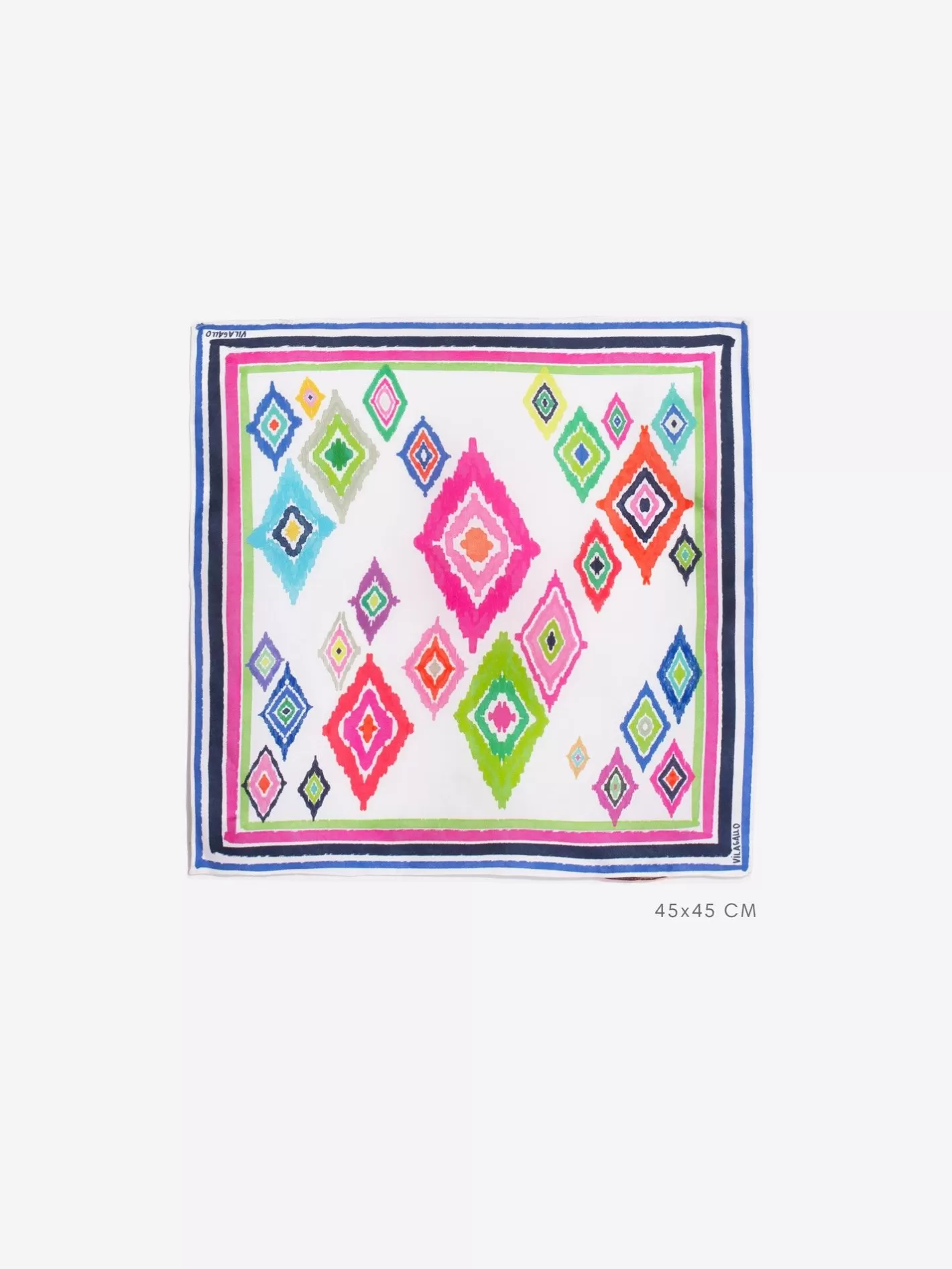 Pañuelo De Seda Mini Ikat Multicolor Sobre Fondo Blanco. Medida: 45 X 45 Cm.
