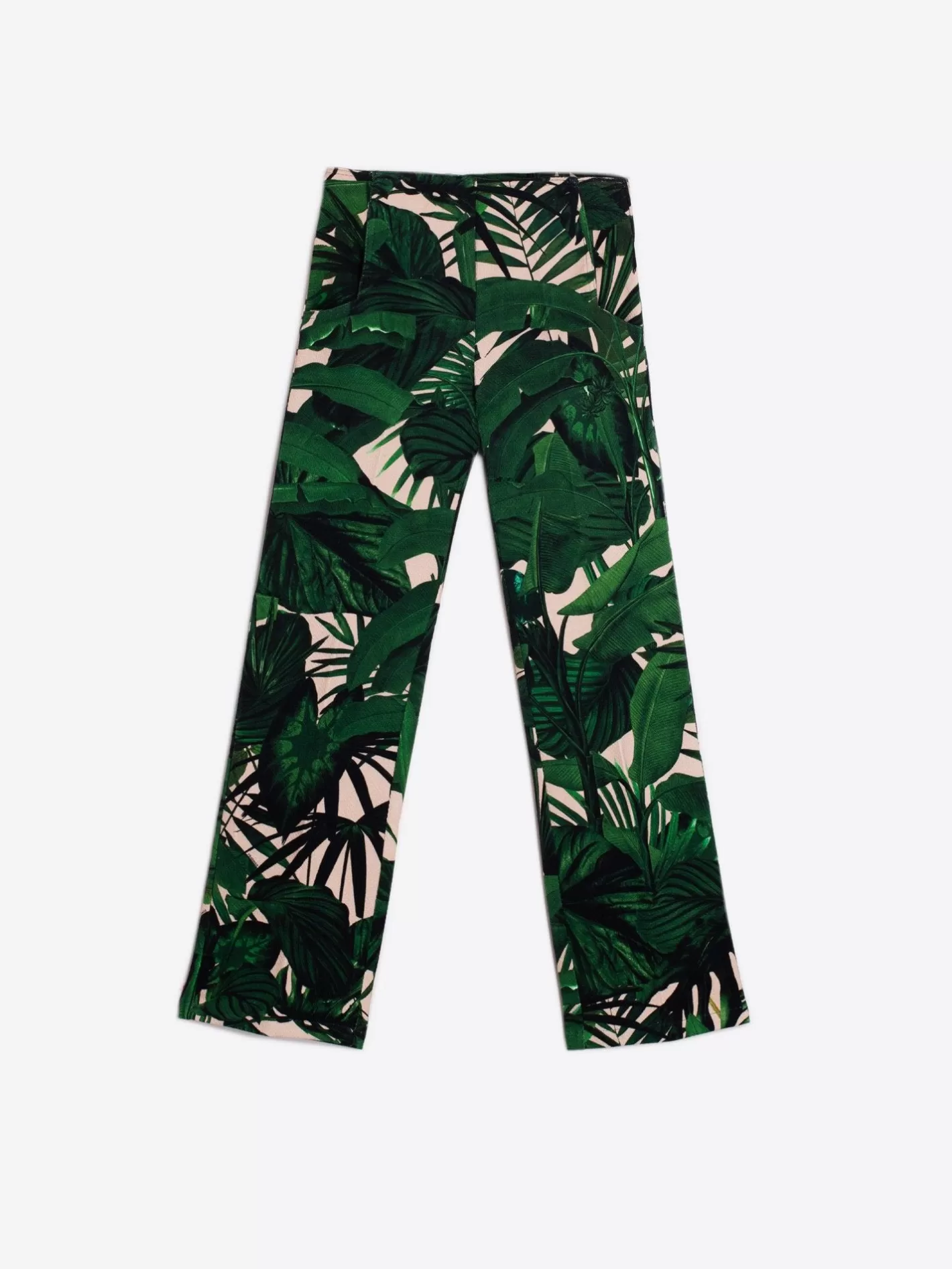 Pantalón Tropical Con Hojas Verdes Y Fondo Crema. Tejido Elástico. Bolsillos Laterales. Cierre Mediante Cremallera Lateral. Chaqueta A Juego Disponible.
