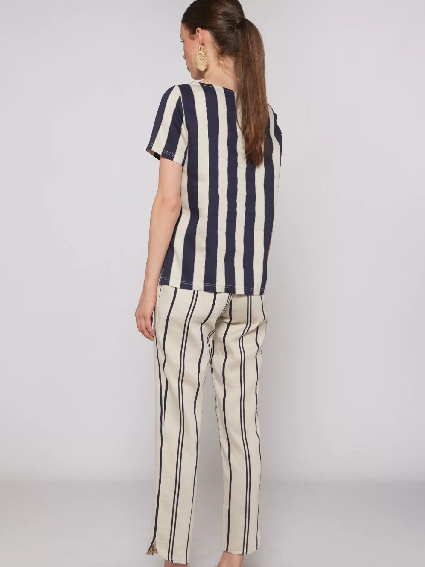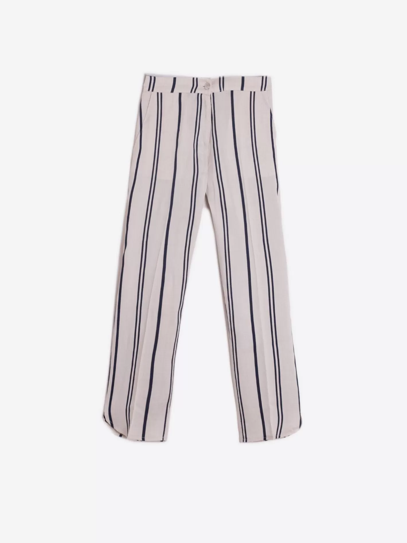 Pantalón Fluido De Lino Con Estampado De Rallas Azules Marinas Yfondo Beige. Bolsillos Laterales. Cierre Mediante Cremallera Frontal Y Botón.Bajo Con Abertura Lateral Redondeada. Camisa A Juego Disponible.
