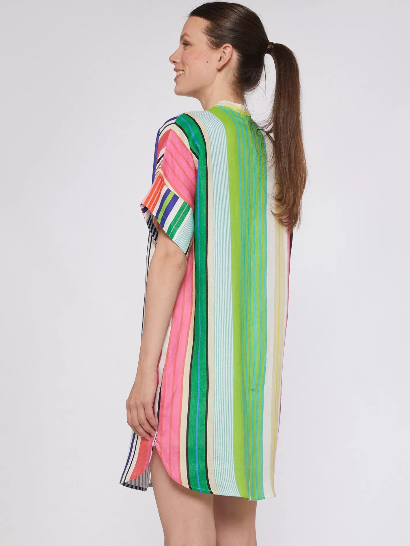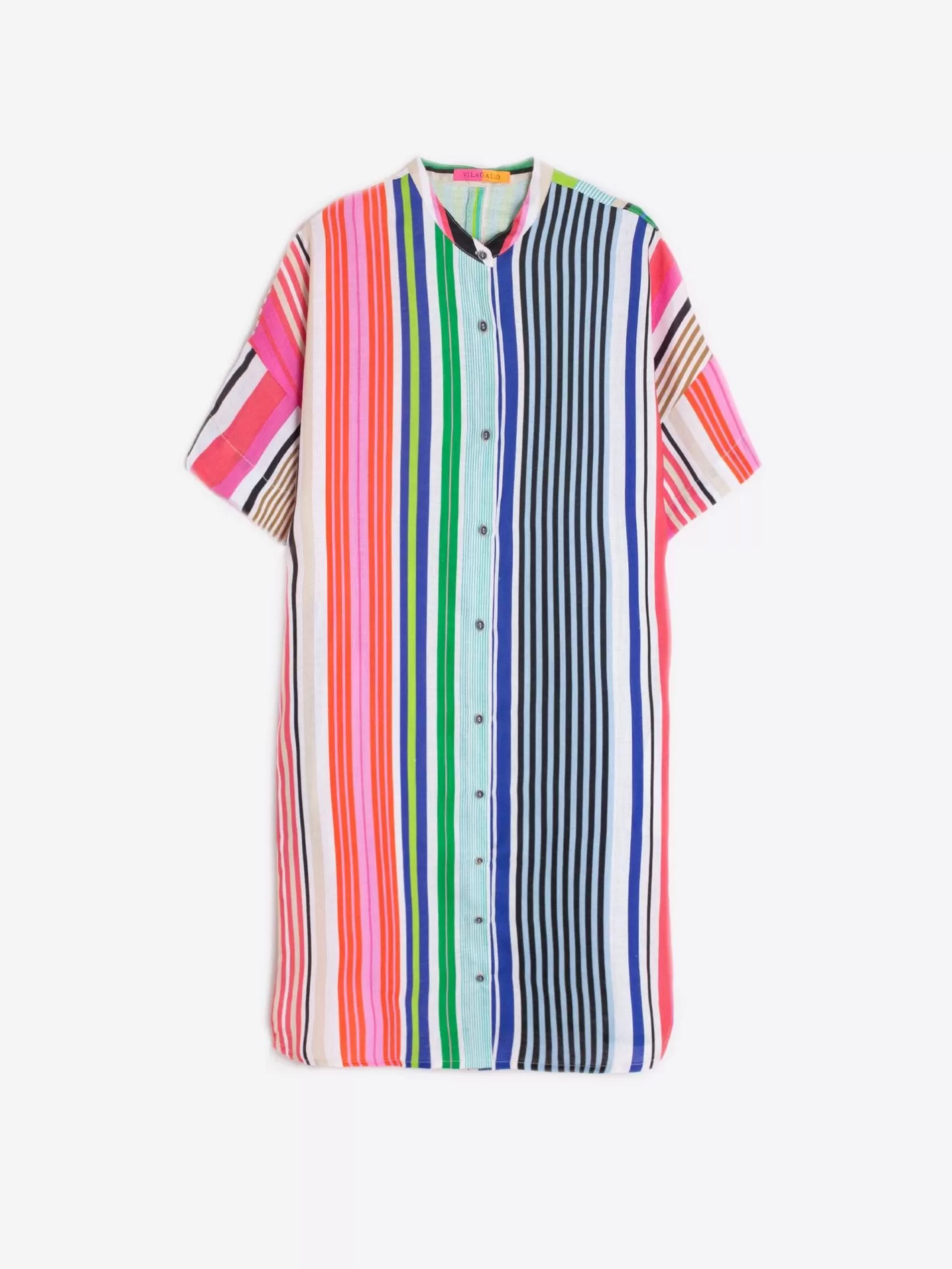 Vestido Camisero 100% Lino. Estampado Con Rayas Verticales Multicolor Y Con Botones En La Parte Delantera. Manga Corta Y…