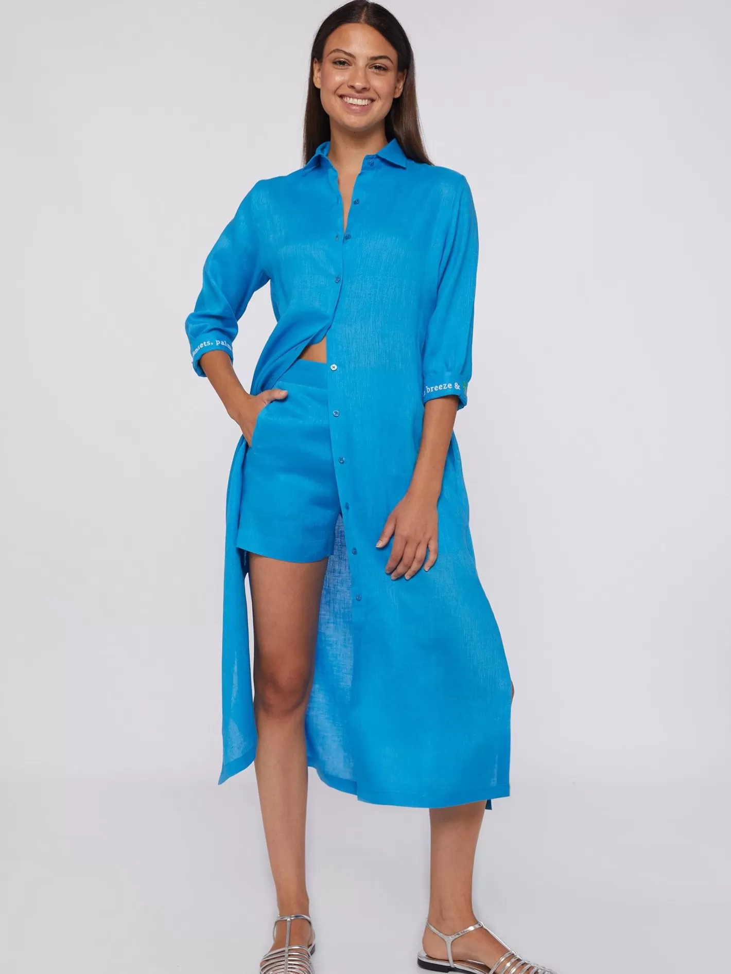 Vestido 100% De Lino Azul Con Frases Bordadas En Las Mangas. Cuello Camisero Y Corte Recto. Cintura Ajustable Mediante Cinturón. Manga Francesa. Tejido Exclusivo Vilagallo Confeccionado En España. La Modelo Mide 1,76Cm Y Utiliza La Talla 38.