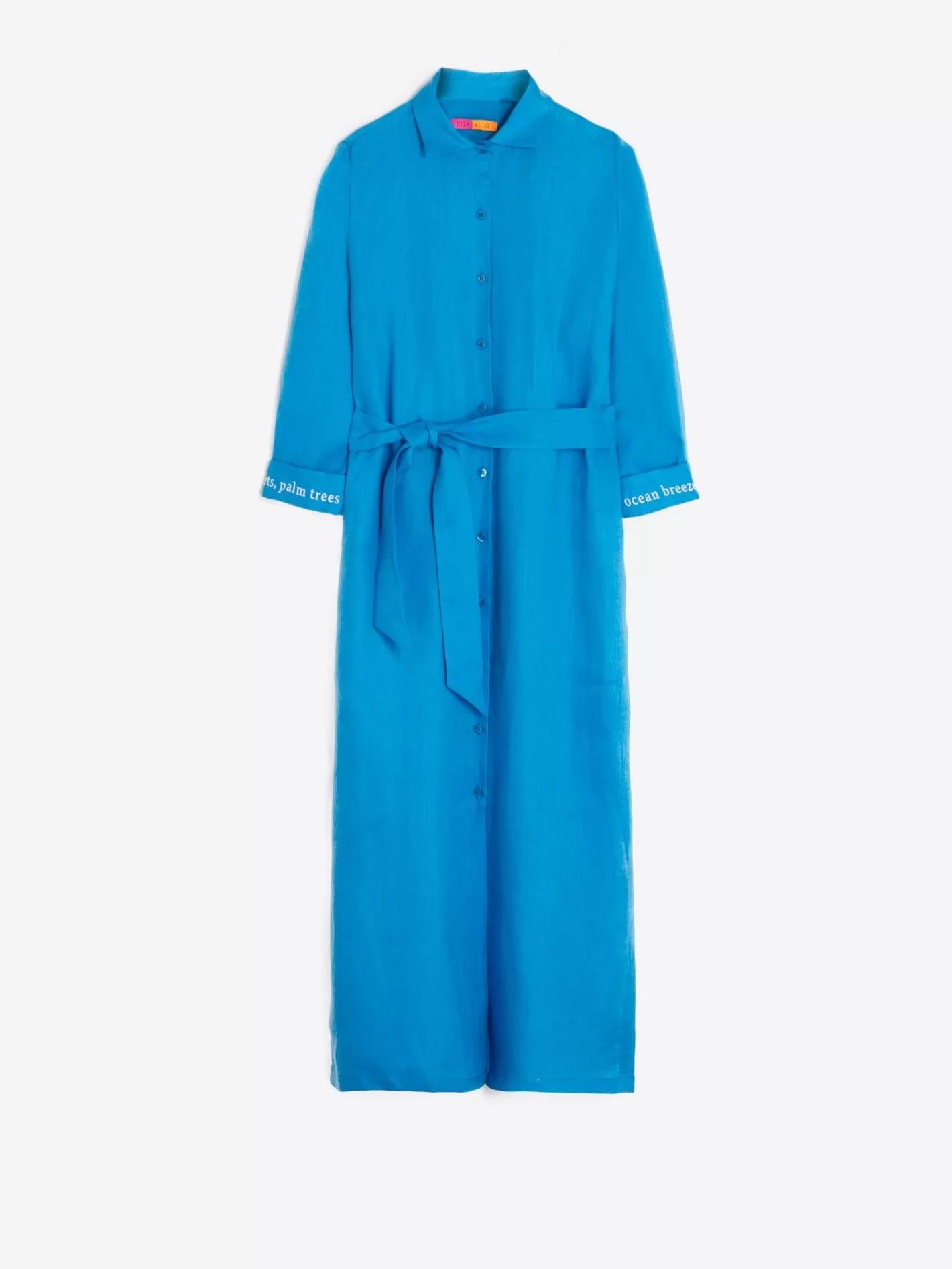 Vestido 100% De Lino Azul Con Frases Bordadas En Las Mangas. Cuello Camisero Y Corte Recto. Cintura Ajustable Mediante C…