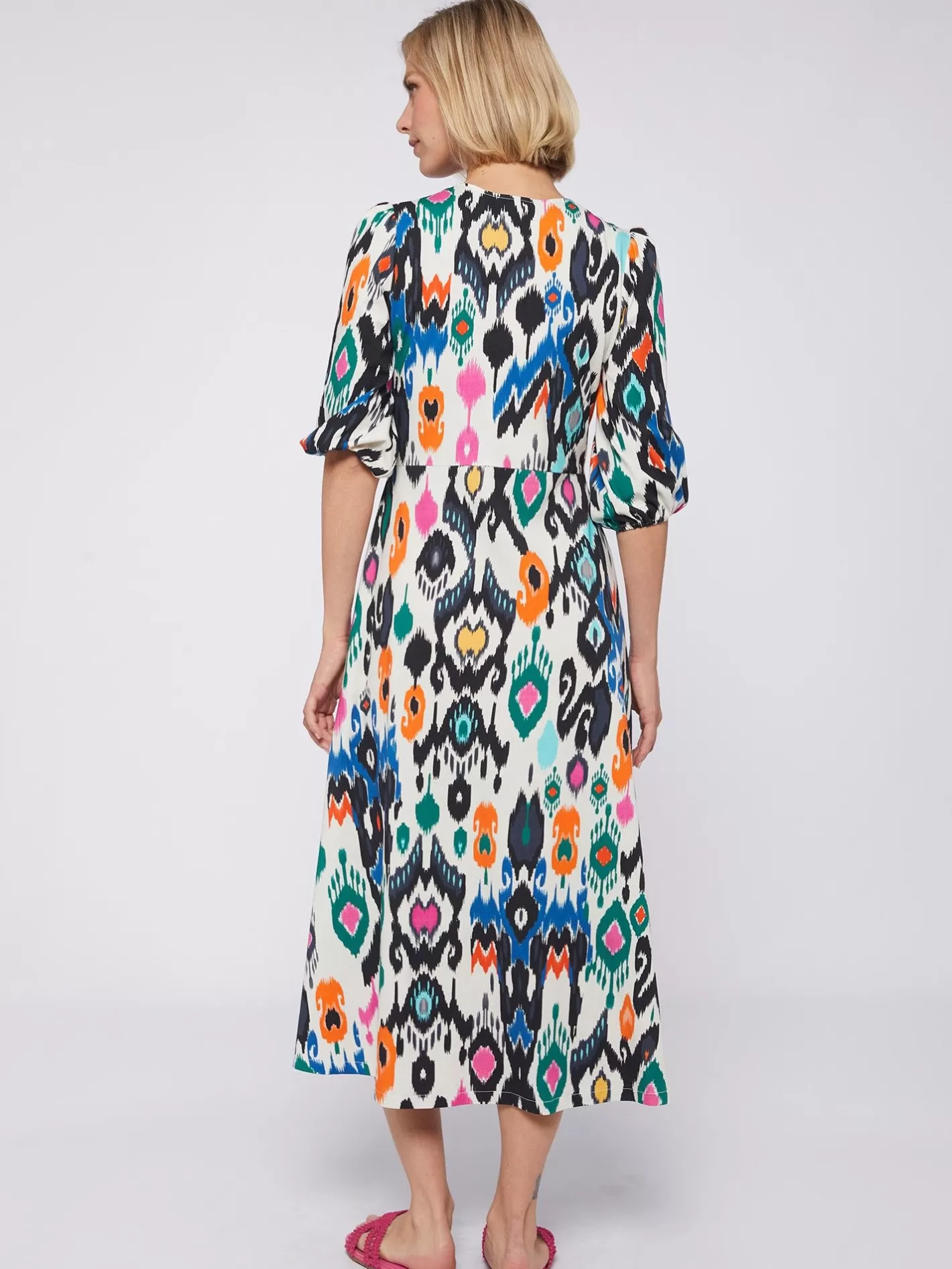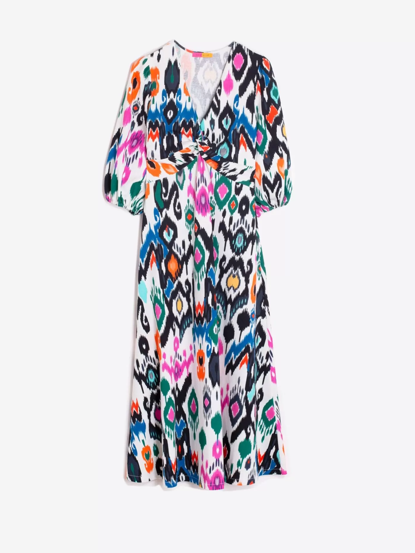 Vestido Midi De Punto Estampado Ikat Multicolor. Escote En Pico. Tejido De Punto Elástico Exclusivo Vilagallo. La Model…