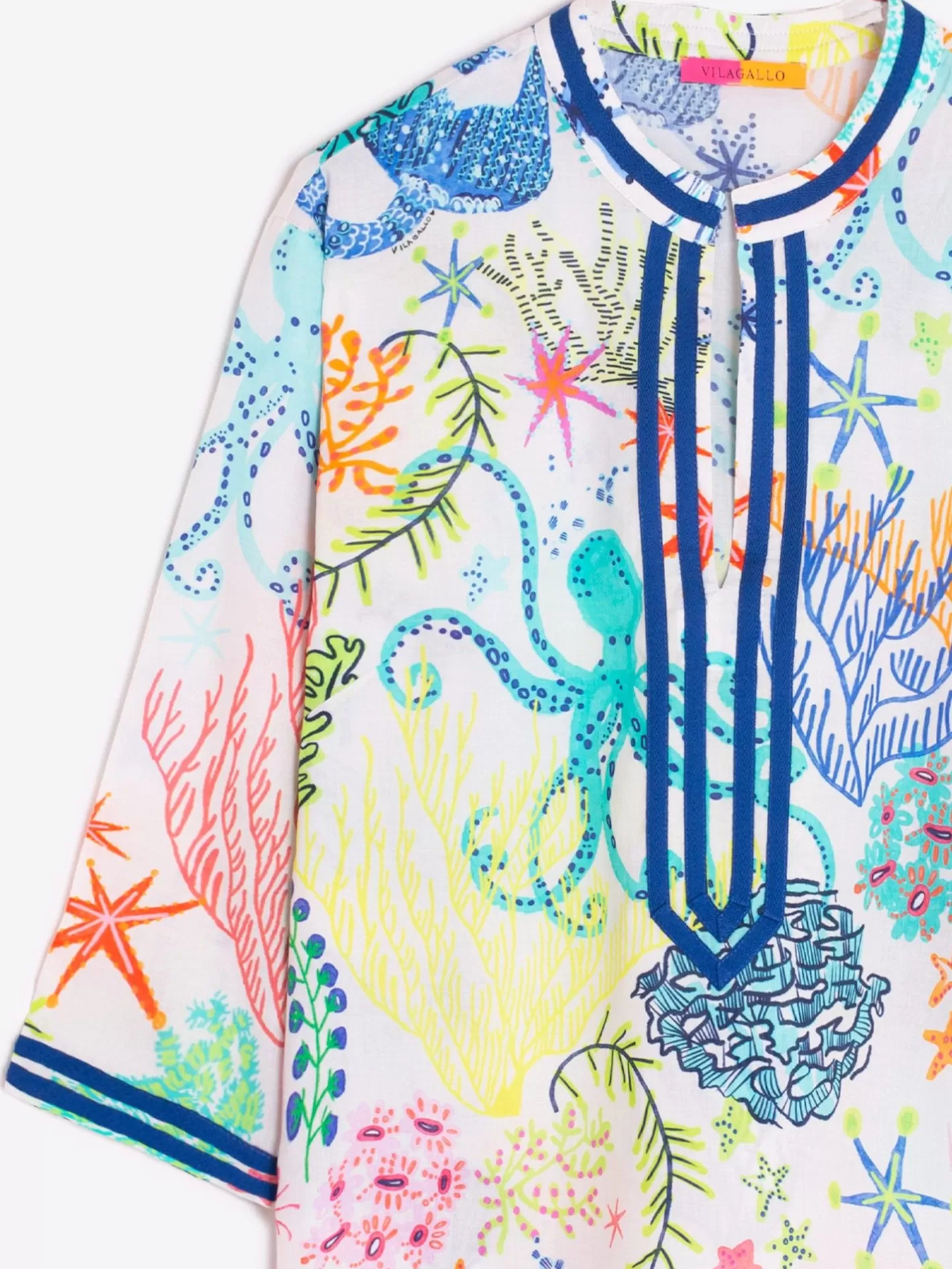 Vestido Corto De Algodón Estilo Kaftan Con Dibujos Del Fondo Marino. Cuello Mao. Escote En Pico. Manga Larga. La Modelo…