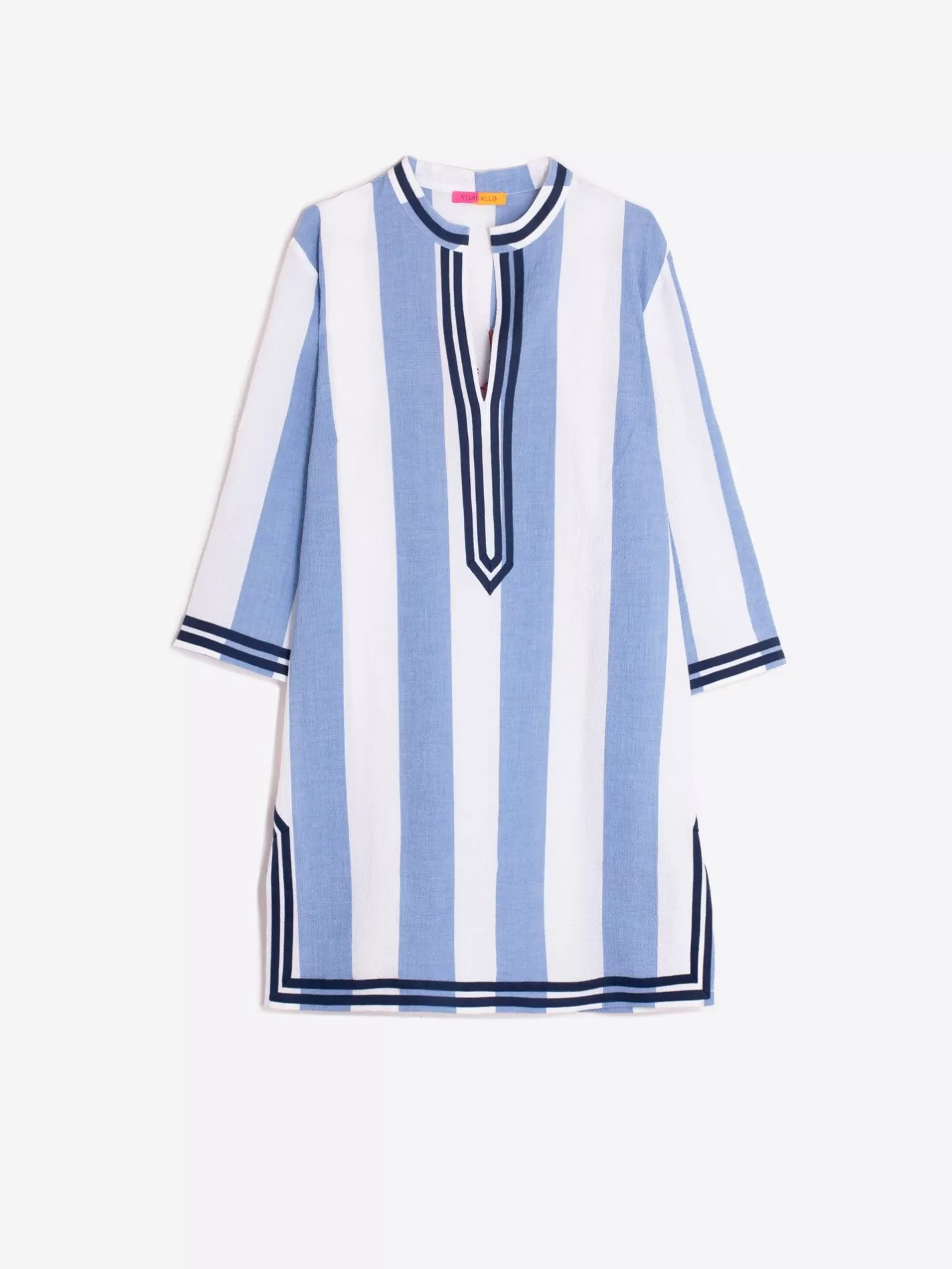 Vestido Corto De Algodón Estilo Kaftan Con Franjas Verticales Azules Y Blancas. Dibujo Bordado De Una Langosta En La Parte Trasera. Cuello Mao. Escote En Pico. Manga Larga. La Modelo Utiliza La Talla 38.