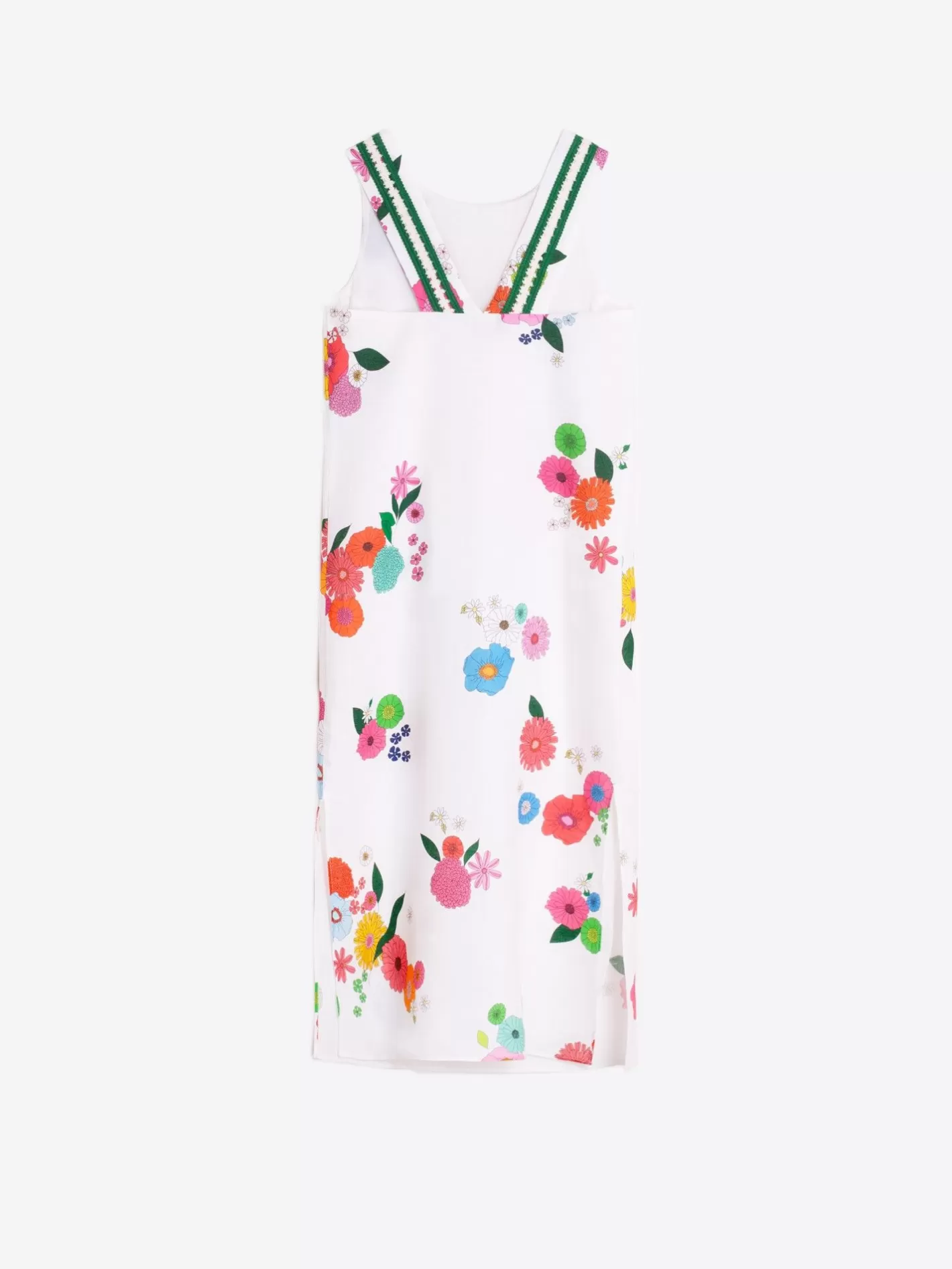 Vestido Midi De Lino Con Estampado De Motivos Florares Sobre Fondo Blanco. Sin Mangas. Cuello Redondo. Detalles Bordados En Los Tirantes De La Parte Trasera. La Modelo Utiliza La Talla 38.