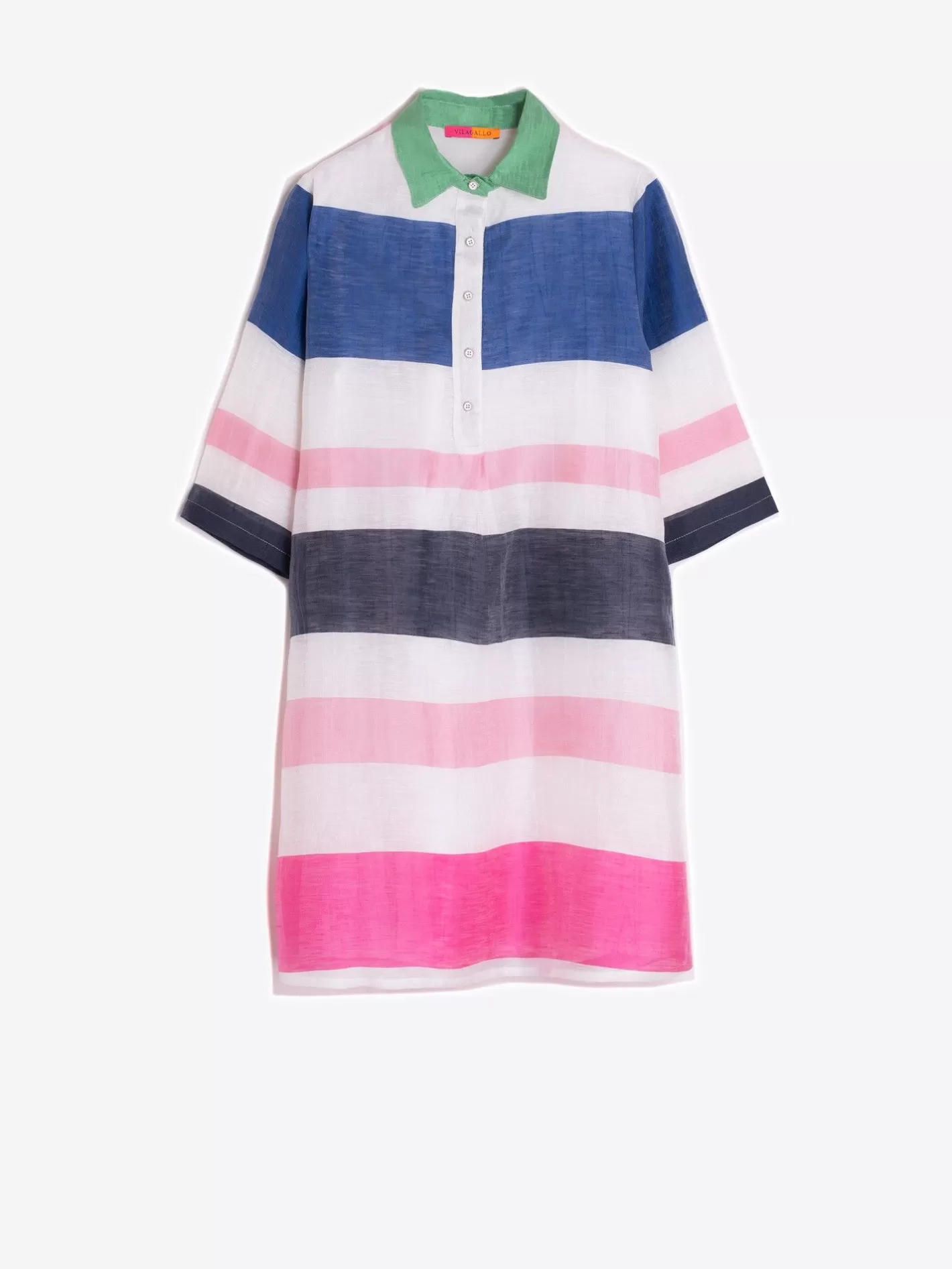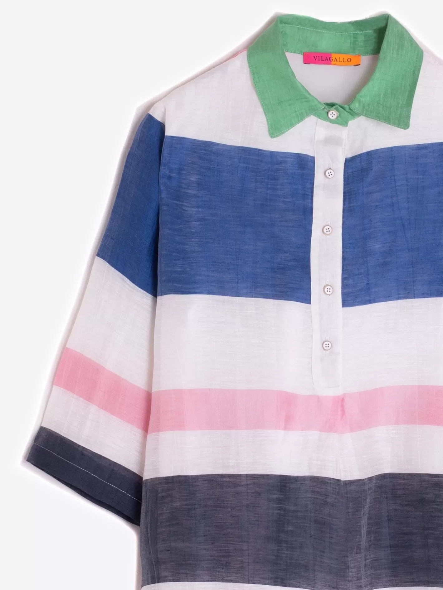 Vestido De Lino Con Estampado De Franjas Horizontales Multicolor. Manga Tres Cuartos. Cuello Camisero. La Modelo Lleva L…