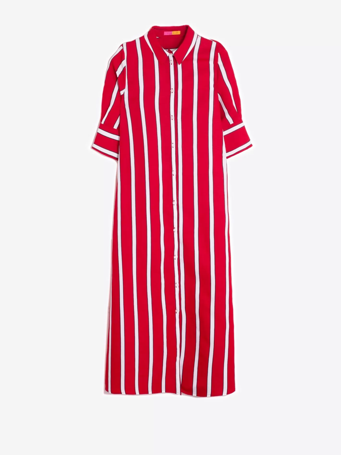 Vestido Midi De Franjas Verticales Rojas Y Blancas. Cuello Y Puños Camiseros. Botonadura Delantera. La Modelo Utiliza L…