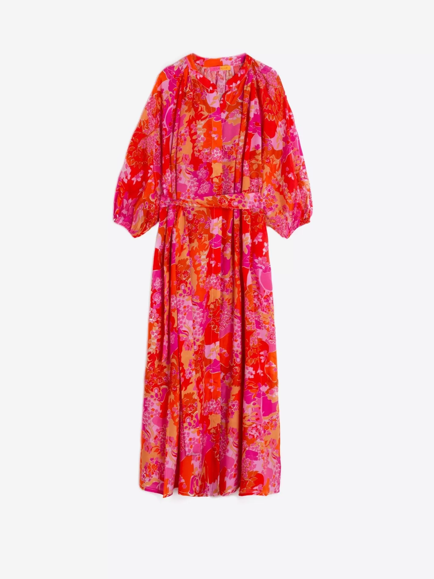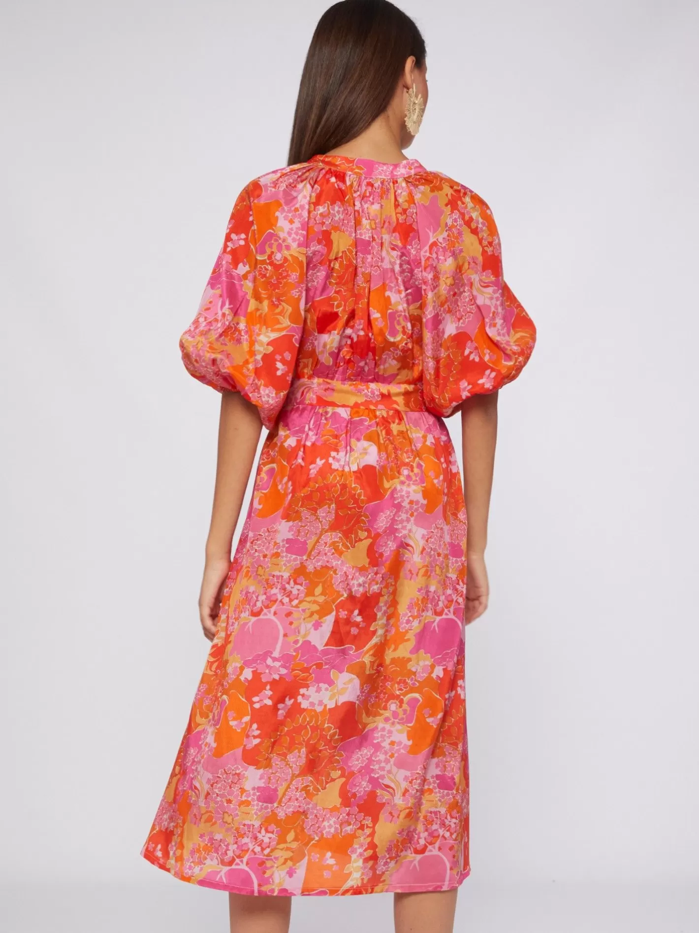 Vestido Midi De Algodón Con Mangas Abullonadas Y Estampado En Tonos Naranjas Y Rosas. Cinturón Fijo En La Parte Traser…