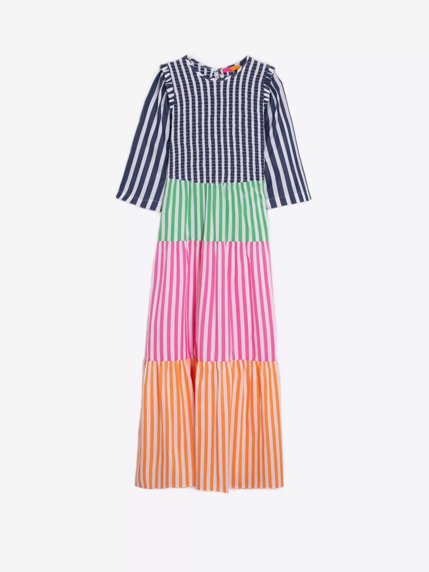 Vestido Largo Con Manga Francesa. Estampado Con Rayas Verticales Multicolores. Cuello Redondo Y Falda Fluida. Tejido Exc…