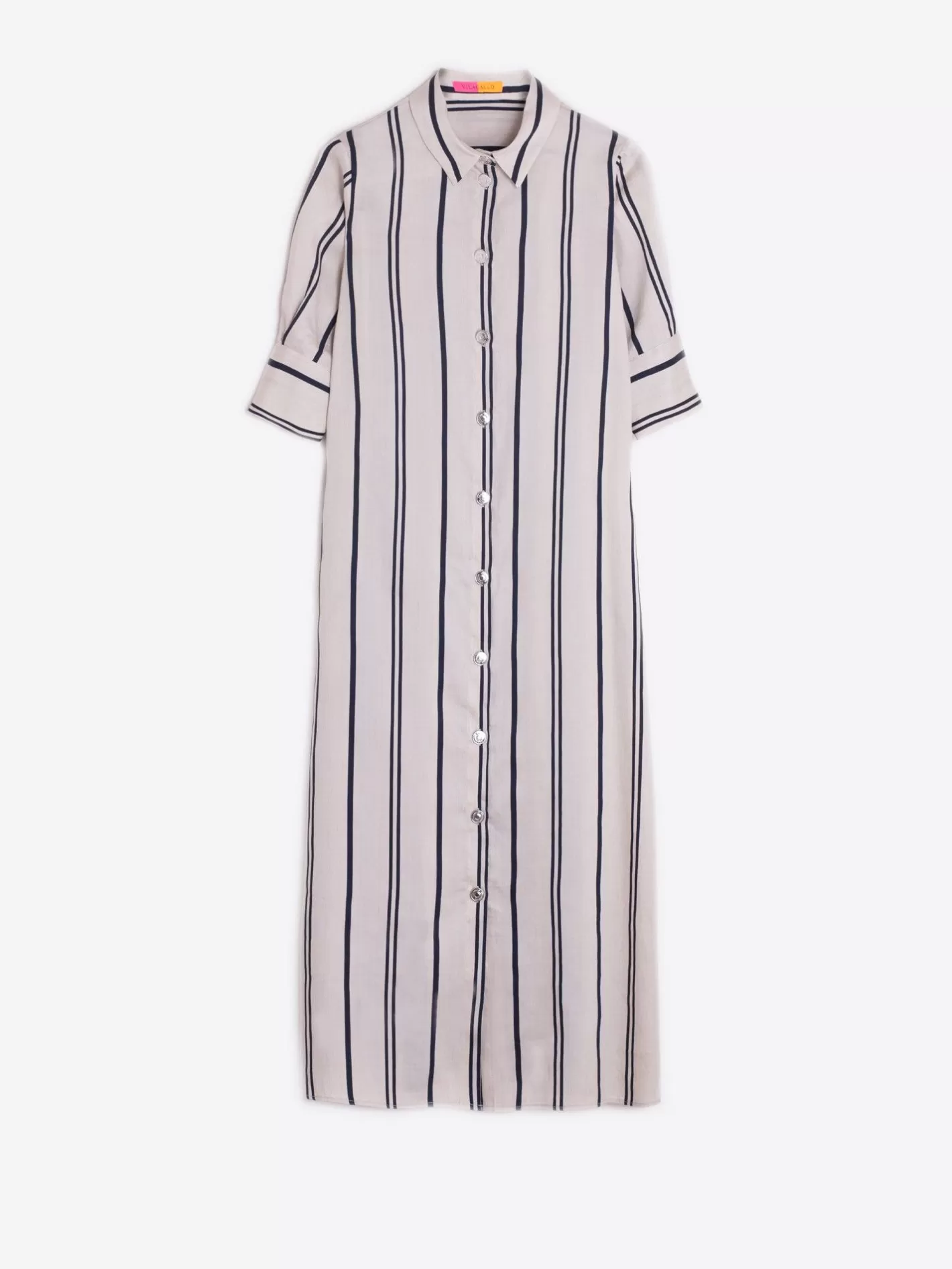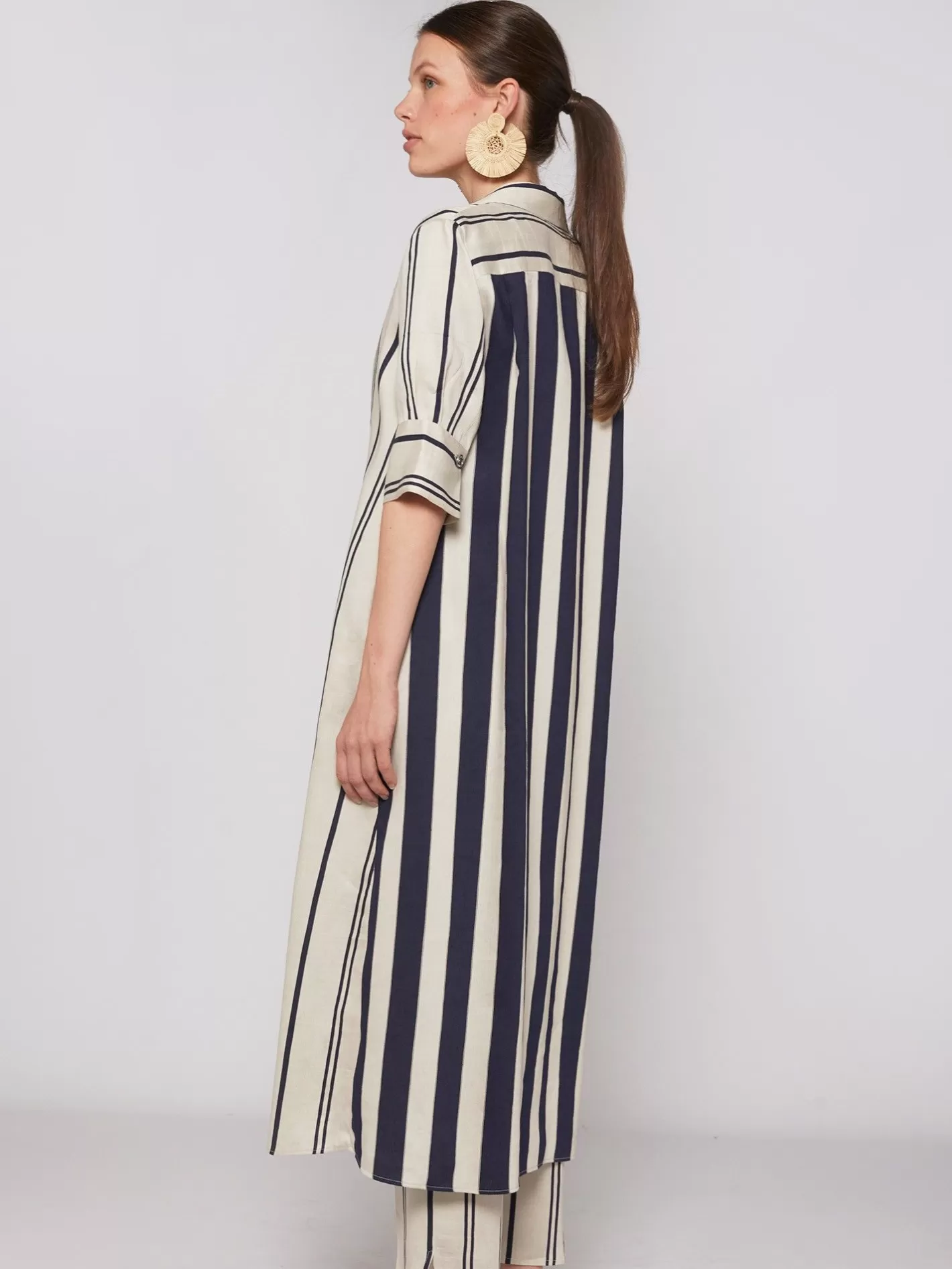 Vestido Midi De Franjas Verticales En Crudo Y Azul Marino. Cuello Y Puños Camiseros. Botonadura Delantera. La Modelo Ut…